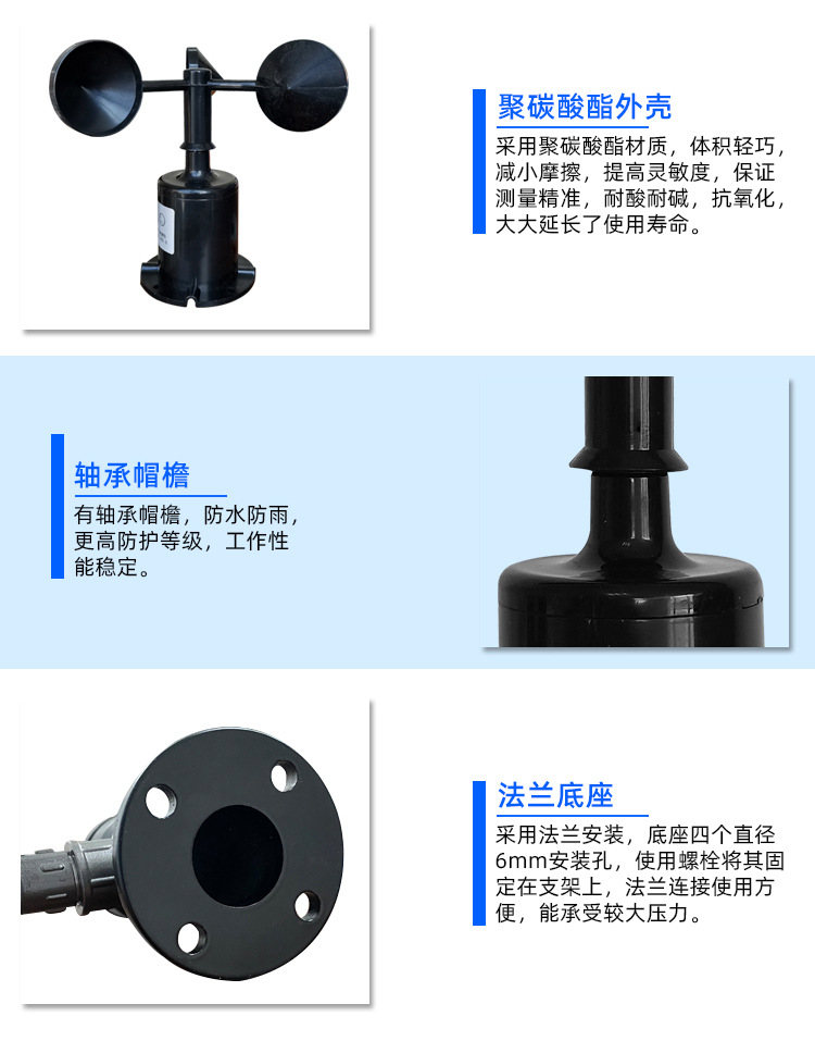 風速傳感器采用傳統三風杯結構,風杯選用ABS碳纖維復合材料,強度高,啟動好;信號處理單元可根據用戶需求輸出各種信號。本產品具有量程大、線性好、觀測方便、穩定可靠等優點,可廣泛用于氣象、海洋、環境、機場、港口、實驗室、工農業及交通等領域。